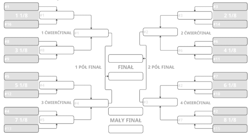 1/8; ćwierćfinał; półfinał; finał + mały finał.Ilość zawodników - Do każdego etapu potrzebne jest odpowiednio 16/8/4 zawodników.